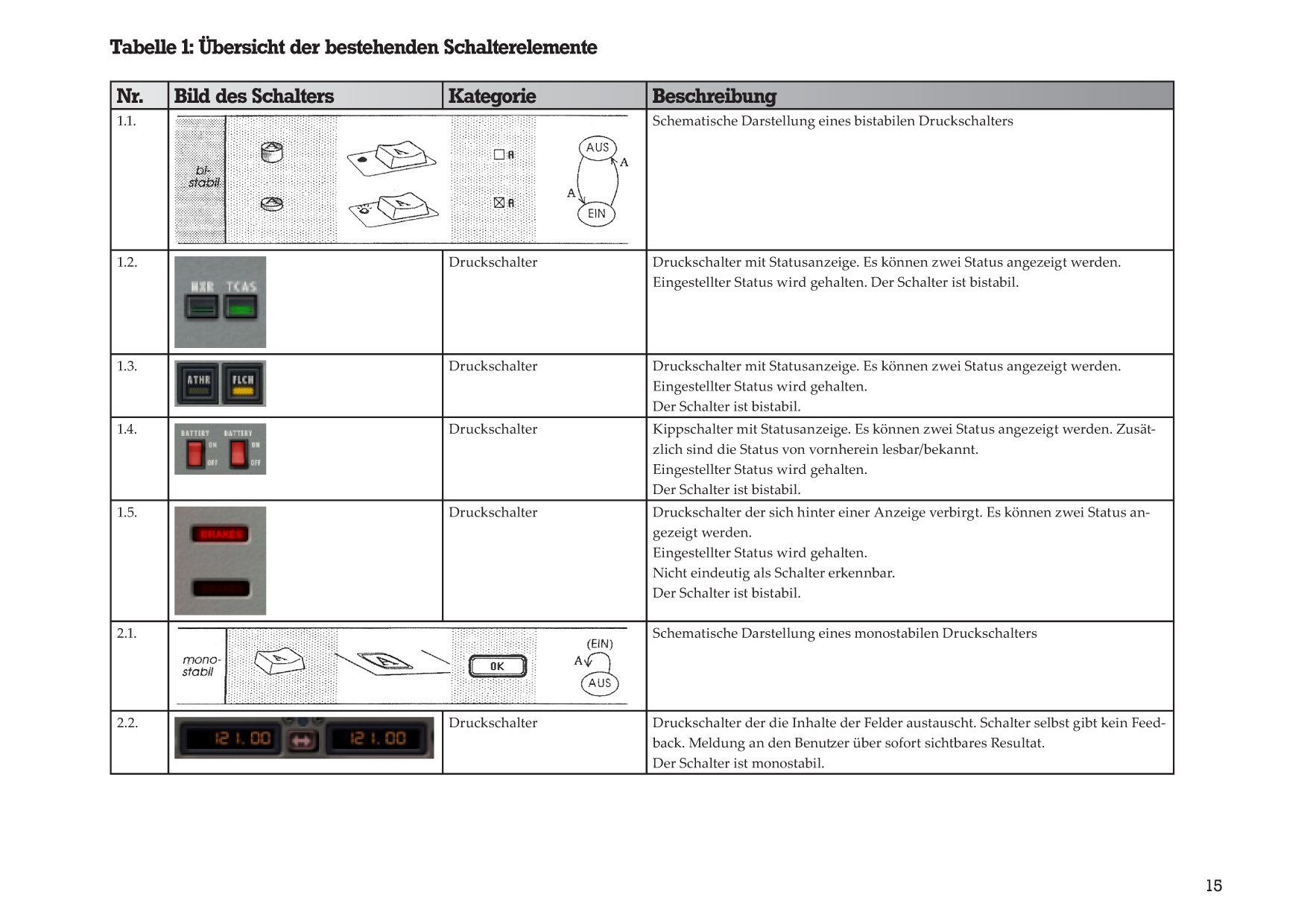 The paper is the result of the first collaboration of the faculties of Aviation and Information Design at the university of applied sciences FH Joanneum. The objective of this cooperation was to create a library of switches which can be used trouble-free on the new touchscreen interface of the experimental flight simulator JFS². In the future this library, respectively collection, shall provide the right switch for different functionalities within the cockpit without time consuming tests.